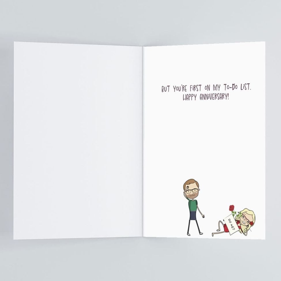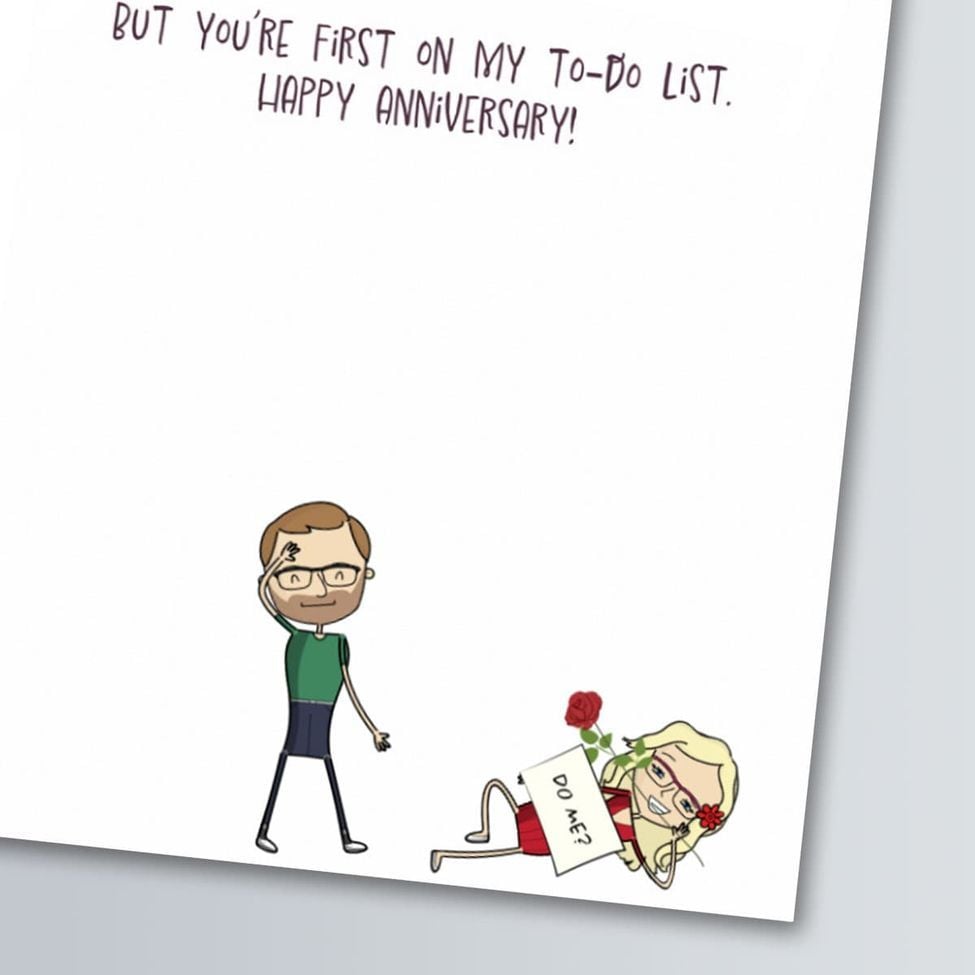 Get a little frisky this anniversary with your favorite "to-do" list. This card can be personalized with your LoveMoji cartoon characters.
